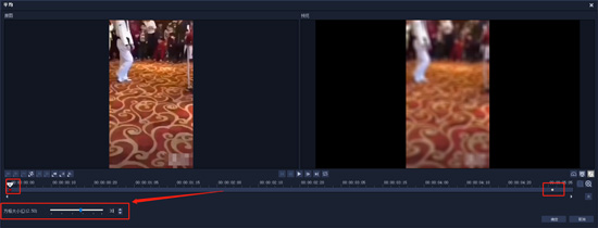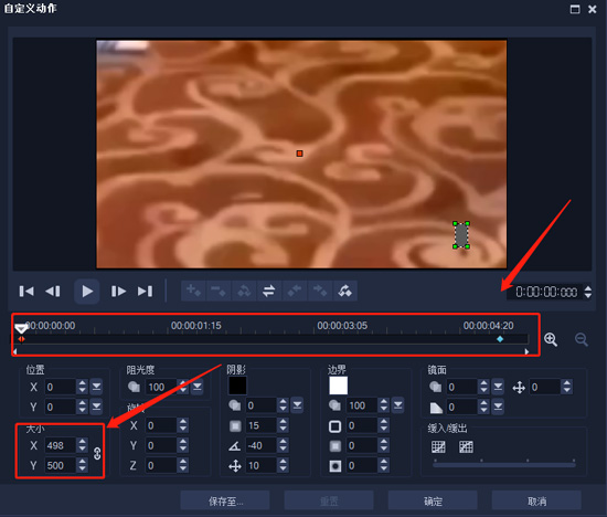 4、设置自定义动作参数,第一帧大小改为,X:498,Y:500,拖动时间线到结尾处,将首尾关键帧的参数调为相同的,点击确定返回。