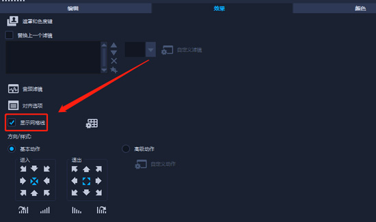 4、双击轨道1上视频素材,点击右侧上方的属性面板中—效果,勾选“显示网格线”。