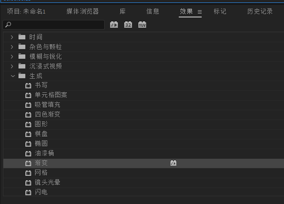 3、在效果面板搜索渐变,双击添加,或者手动拖动到序列上。