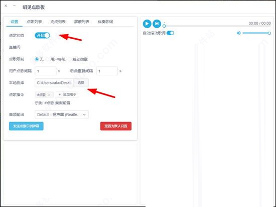 2、然后就可以看到如下界面,我们需要将点歌状态打开,然后在“本地曲库”中找到自己的歌单,就可以将其导入了;