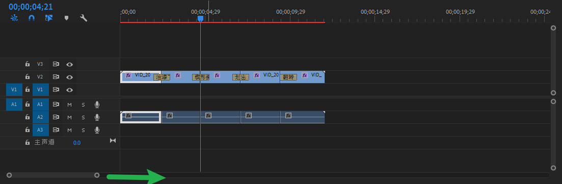 1、打开pr以及带有转场的项目,然后时间轴上左拉左下角的圆圈,放大时间轴。