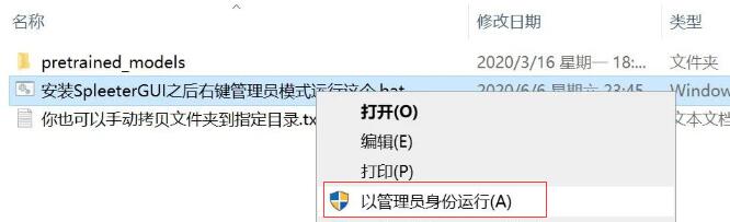 5、双击打开训练模型文件夹,右键-管理员身份运行里面的那个.bat文件,这个批处理文件会自动帮你快速拷贝pretrained_models文件夹到SpleeterGUI的C盘安装目录。