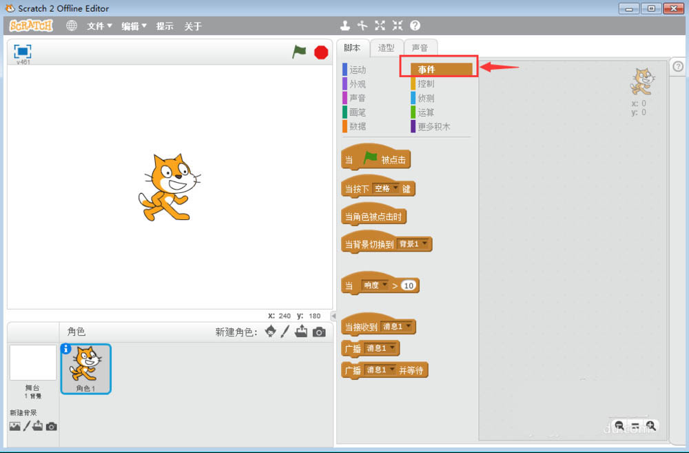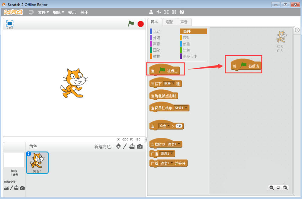 3、将当绿旗被点击时拉到脚本编辑区中;
