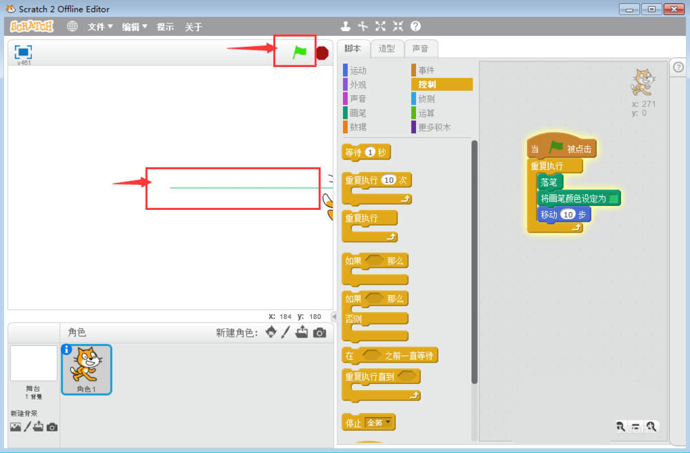 10、点击绿旗执行程序,小猫运动时,就可以通过画笔记录下小猫的运动轨迹。