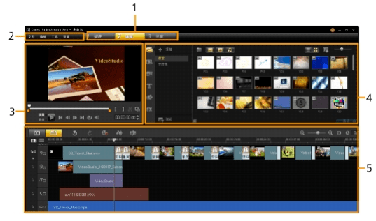 1 - 步骤面板:包括捕获、编辑和分享按钮,这些按钮对应视频编辑过程中的不同步骤。