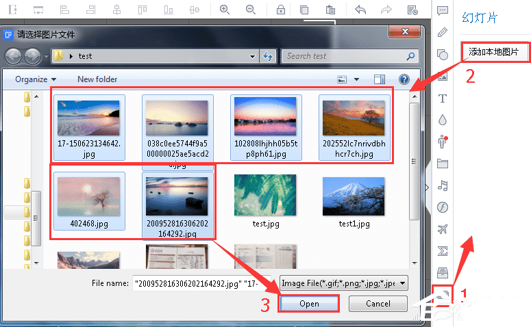 1. 添加图片幻灯片在元素编辑栏中找到相应图标-》点击“添加本地图片”按钮-》在弹窗中选择需要添加的图片-》“打开”。