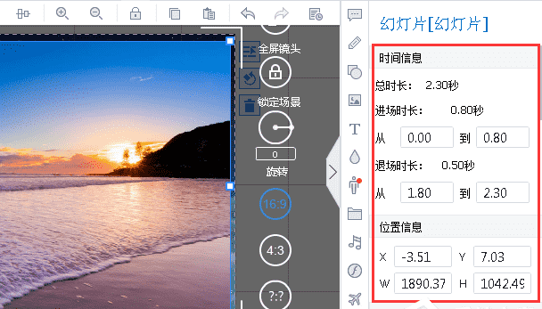 添加完本地图片后,可以自定义图片的大小、位置、进场/退场时长等。