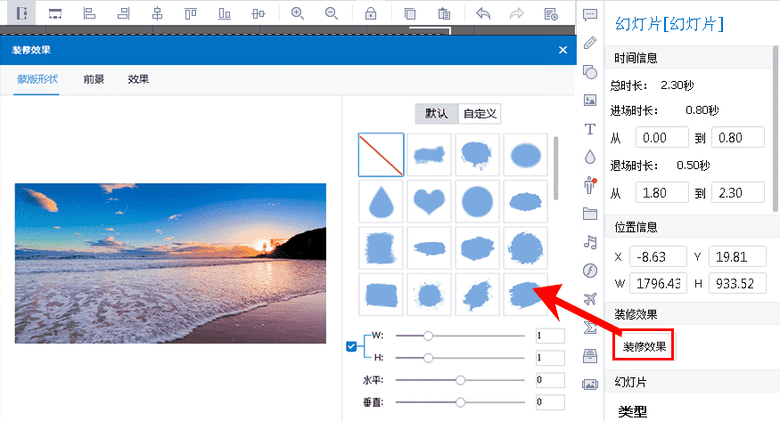 选中添加的图片幻灯片,在右侧编辑栏中点击“装修效果”按钮可以设置图片幻灯片的蒙版形状、前景、阴影和边框效果。