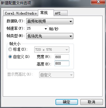 4)压缩的类型除了dv格式的,另外两个都可以选择,选择完成后切换至常规,设置视频大小为800:800。点击确认后关闭。