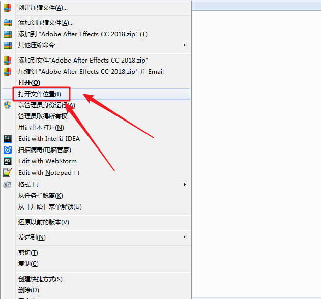 3、如果不清楚安装目录在哪里的,我们可以自己点击桌面上的AE图标,然后鼠标右键,找到“打开文件夹所在位置”,进入AE软件的安装目录