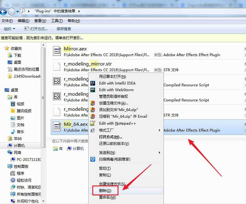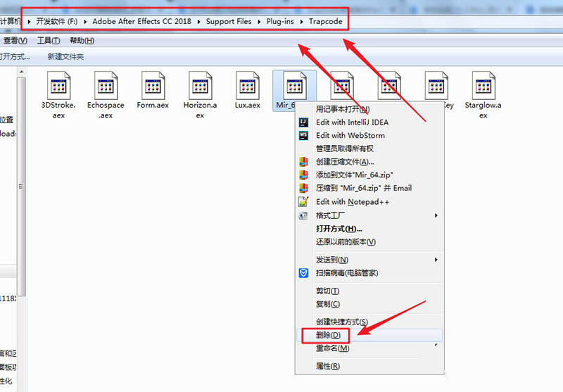 6、找到之后,点击它,然后delete键进行删除,删除之后我们再将我们需要替换的同名插件复制到这里来即可,然后再打开我们的AE软件检查是否会报错