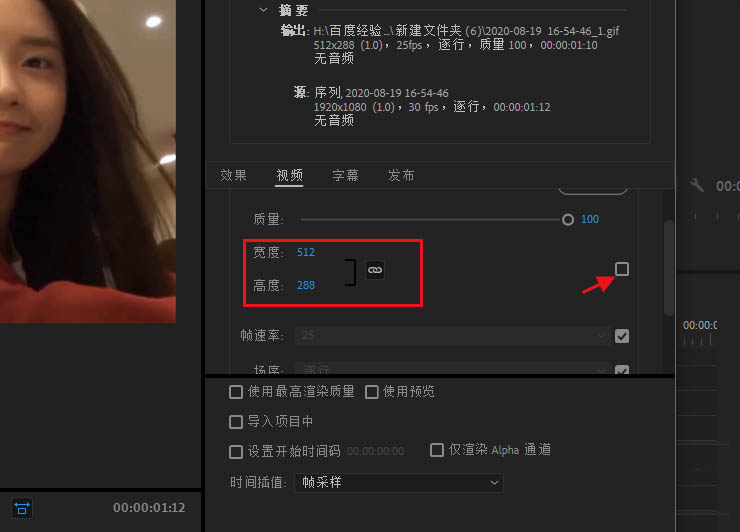 4、最好动画gif格式后,将视频的宽度和高度调小。