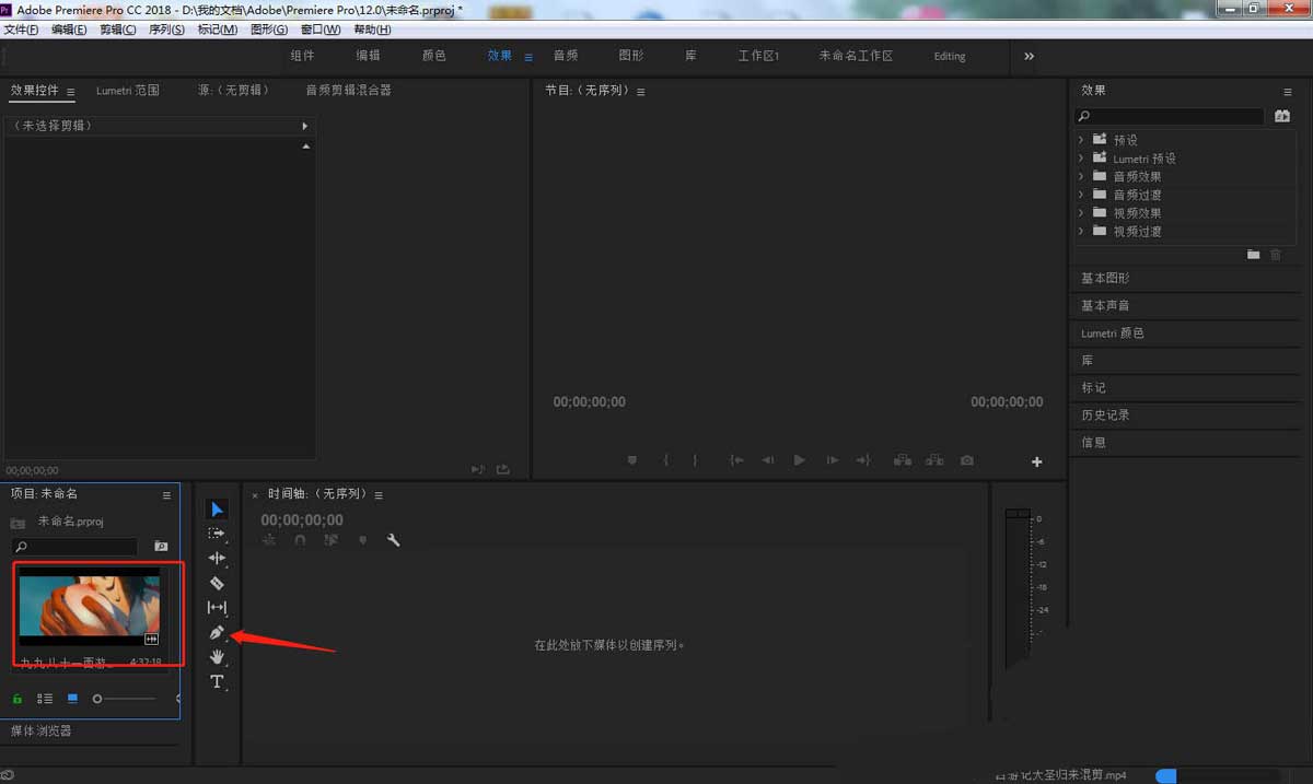3、长按鼠标左键,将导入的视频文件素材拖动到右侧时间轴上面。