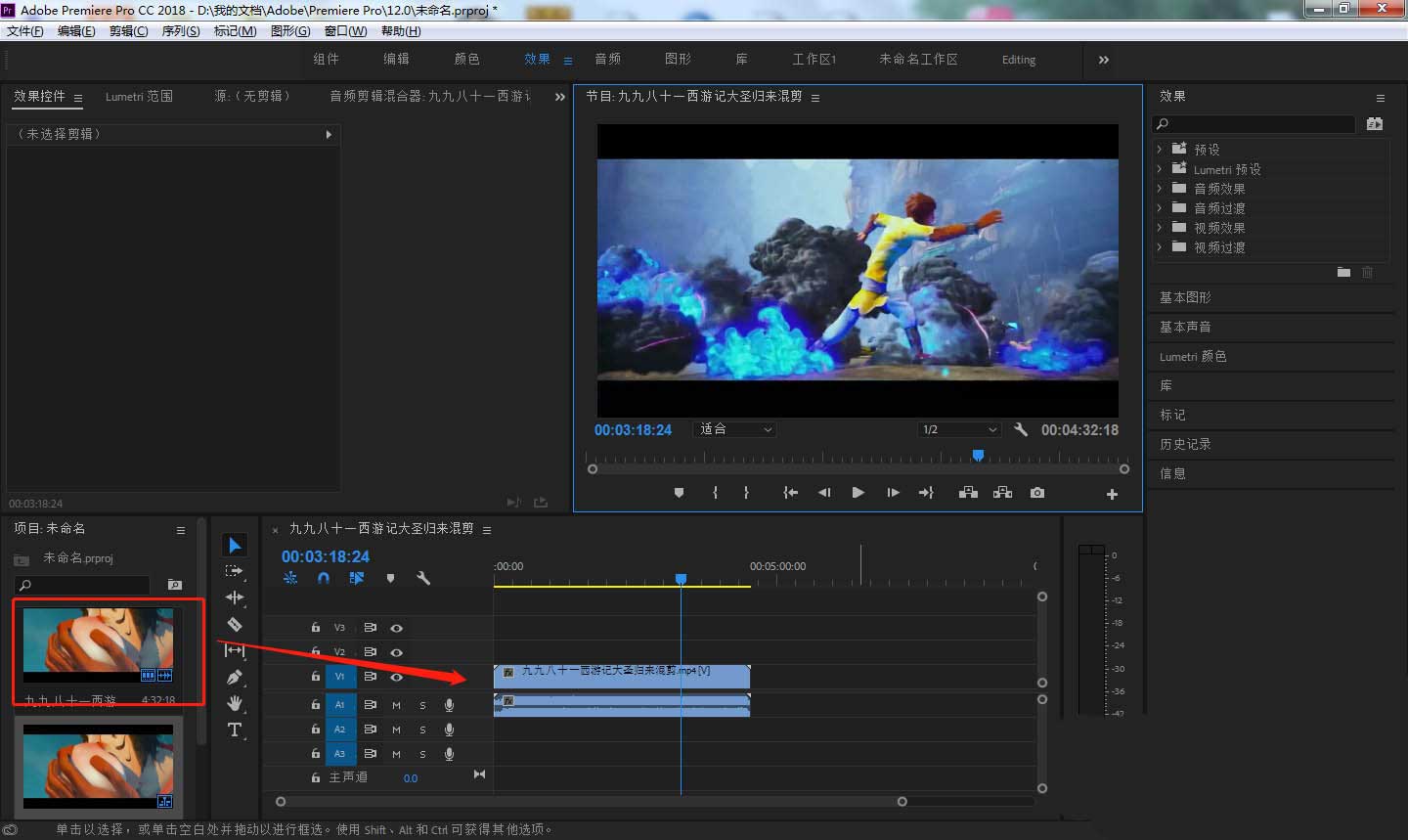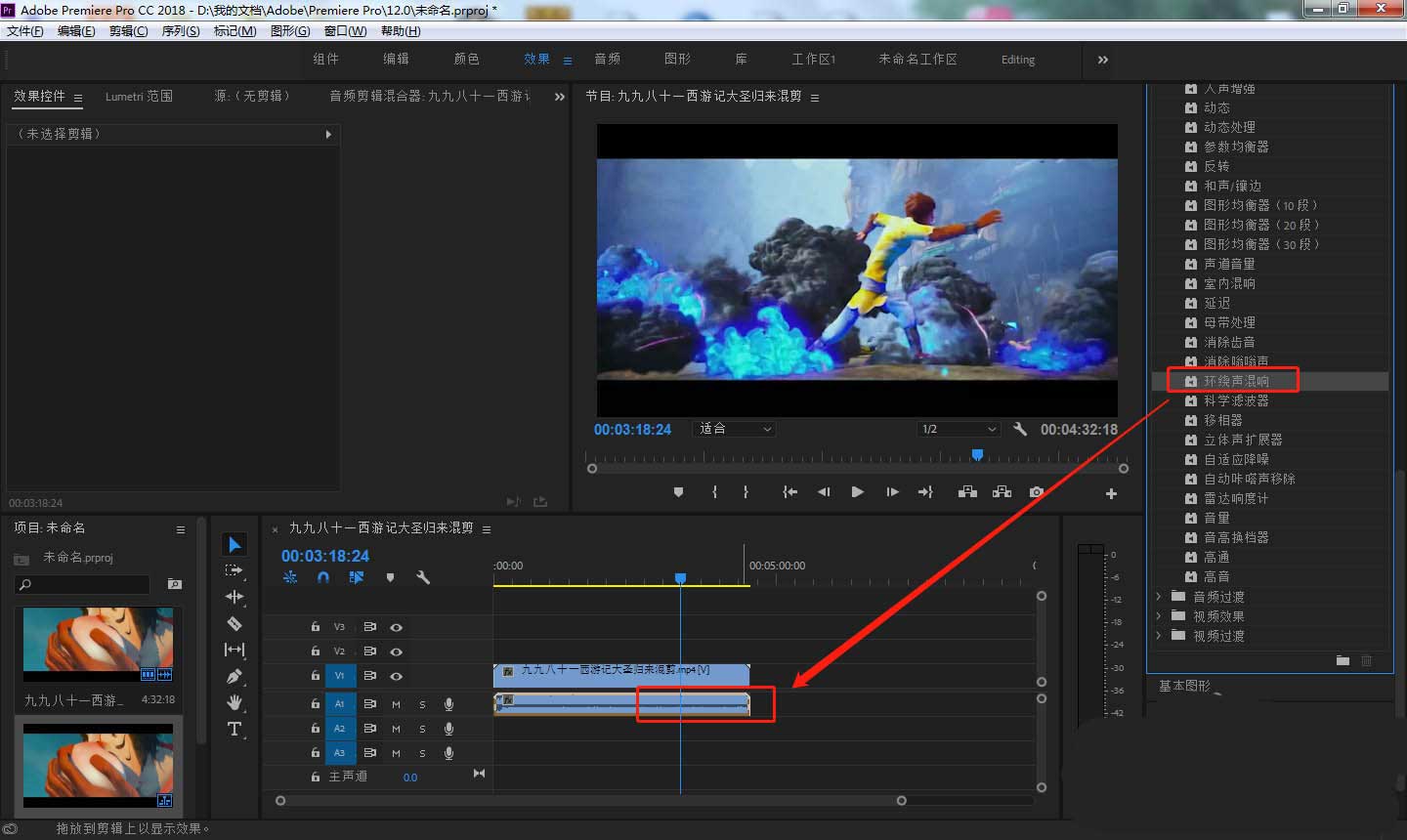 4、点击右侧效果窗口中的”音频效果“——”环绕声混响“,将该效果拖动到时间轴的音频轨道上面。
