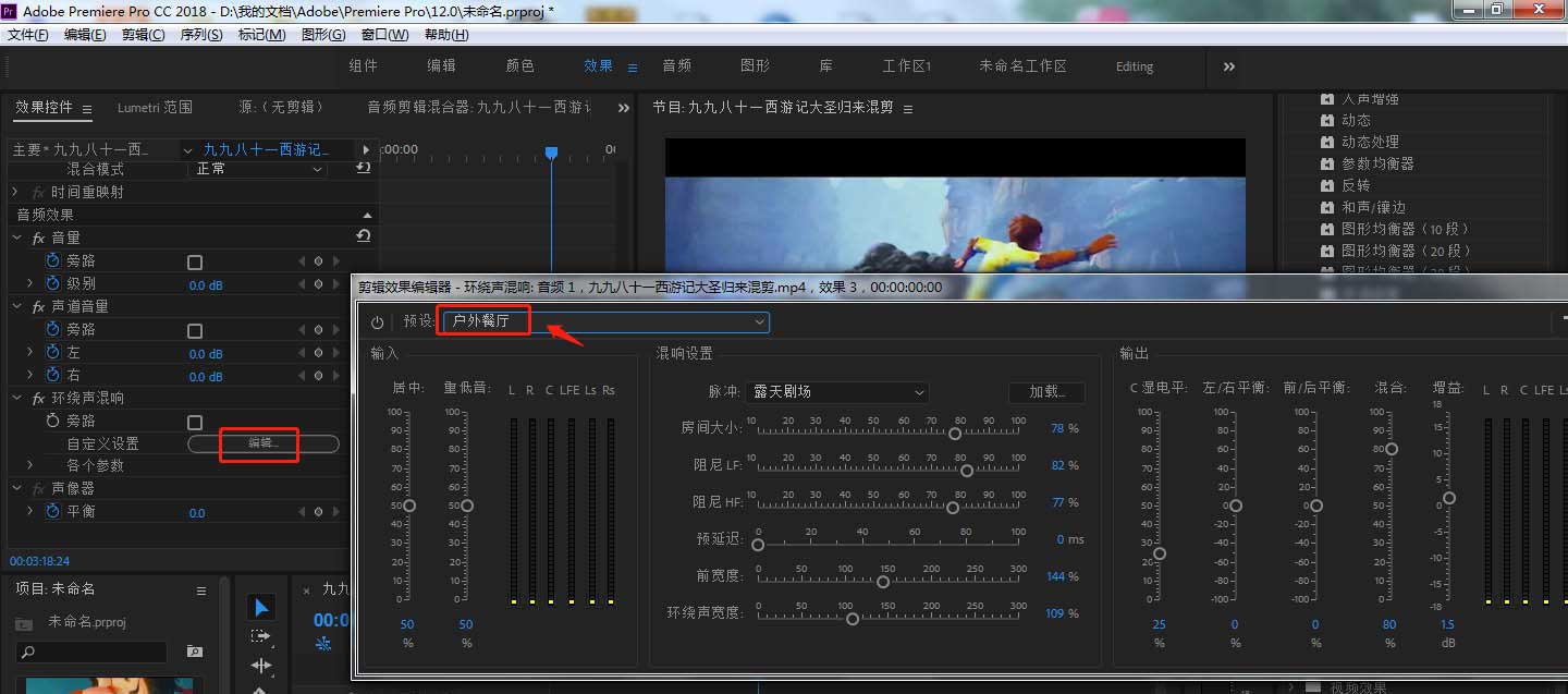 5、点击左上方的效果控件,然后点击环绕声混响后的”编辑“按钮,在弹出的窗口中将预设设置为”户外餐厅“。
