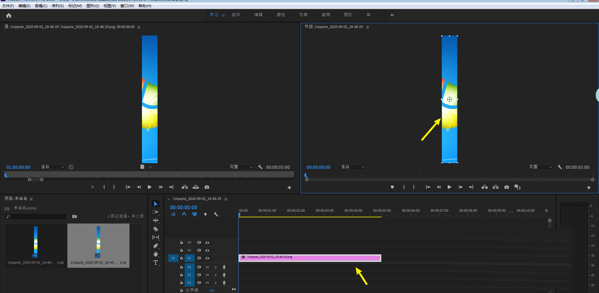 2、选择你的长图打开,图片拖入时间线。