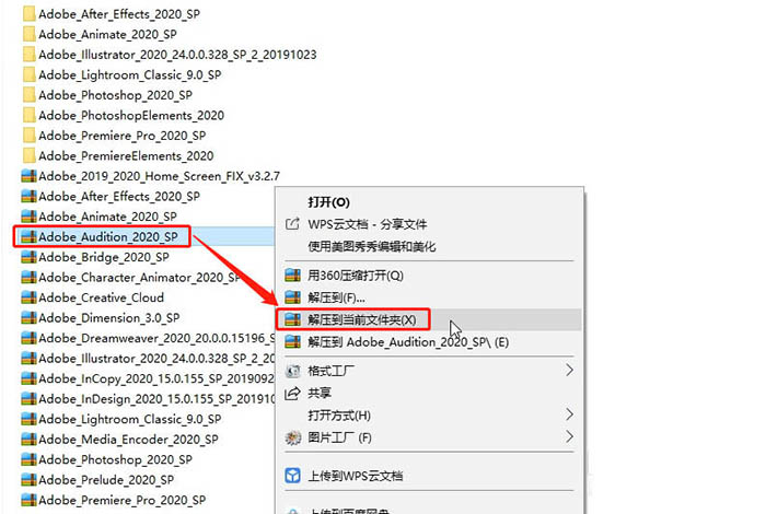 鼠标右键单击Adobe Audition 2020安装包,解压到当前文件夹,等待解压完成,会出现新的Adobe Audition 2020文件夹,文件夹内包含所有的安装程序;