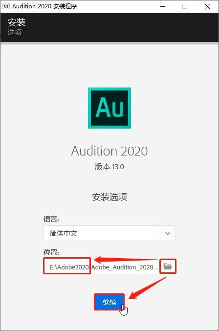 安装位置,我选择的是E盘,Adobe2020文件夹内,刚刚解压出来的Adobe Audition 2020文件夹,作为自己的安装路径,这样所有文件都在一起;