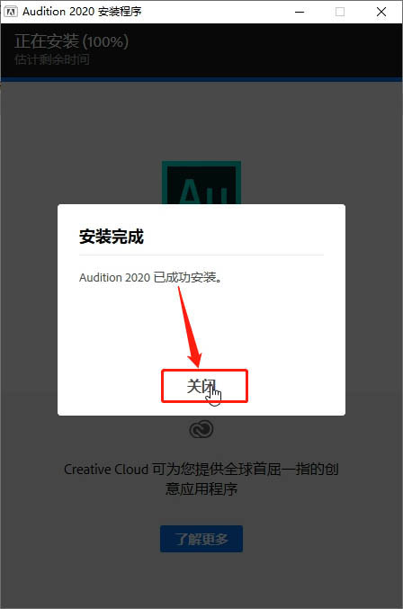 6、Audition 2020已成功安装,点击关闭;