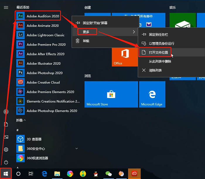 点击电脑左下方的开始,在最近添加里面右键单击Adobe Audition 2020图标,更多,点击打开文件位置;