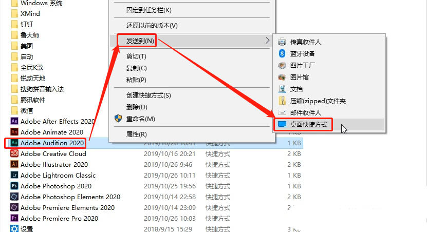 2、鼠标右键单击Adobe Audition 2020快捷方式,发送到,桌面快捷方式;