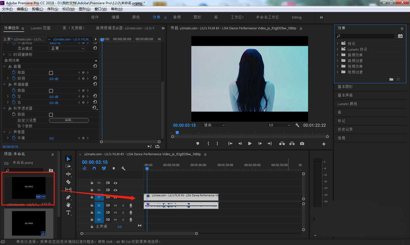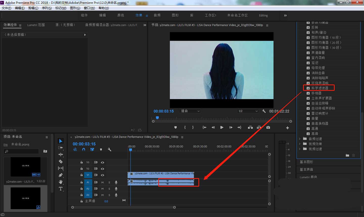 4、点击右侧效果窗口中的“音频效果”——“科学滤波器”,将该效果拖动到时间轴音频轨道上。