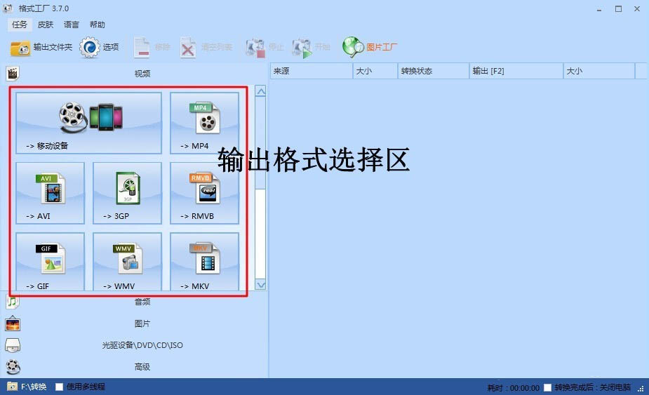 1、打开软件,在输出格式选择区,选择想要的视频格式。