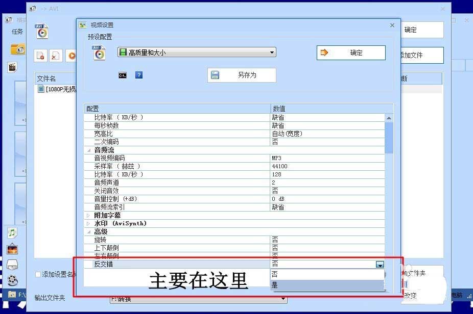 4、再点击【高级】选项里的【反交错】,选择【是】,选择好再点击上边的【确定】这是关键步骤所在!