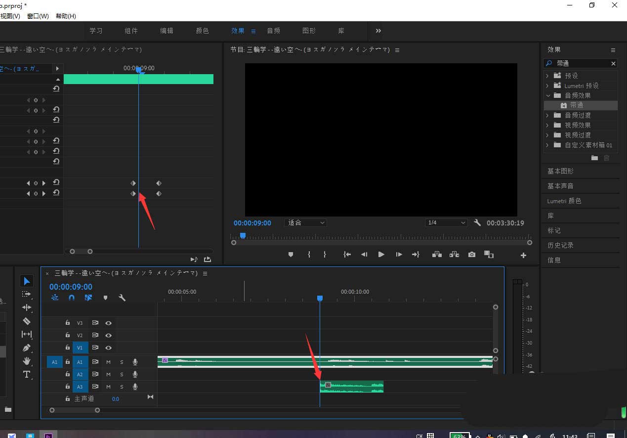 5、这只是对现存音频做的一些简单效果,要想入水效果更为正常,最好找到一段带有水声的音频素材放在入水的那一刻。水中的素材接在关键帧之间(关键帧模拟的是一个从水面到水中音量大小的变化)。