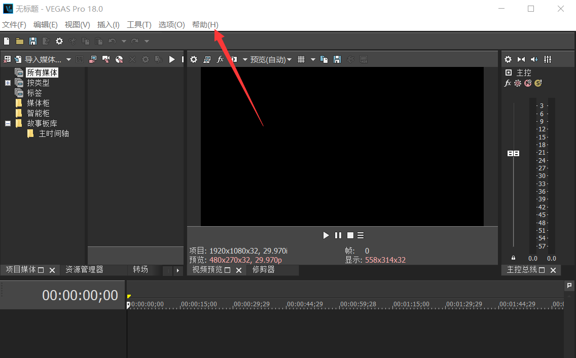 1、在电脑上打开Vegas软件,然后点击顶部菜单栏的“帮助”。