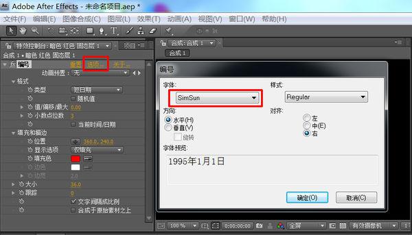 再选择这个字体就可以了,这个是宋体。在合成窗口也是正确的字体。