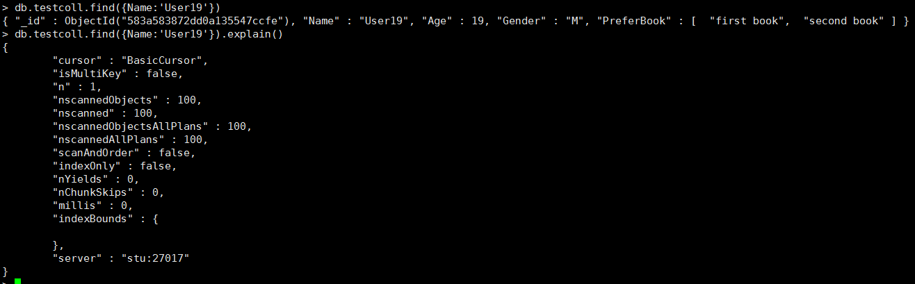 > db.testcoll.find({Name:'User19'}).hint({Name:1,Age:1}).explain()