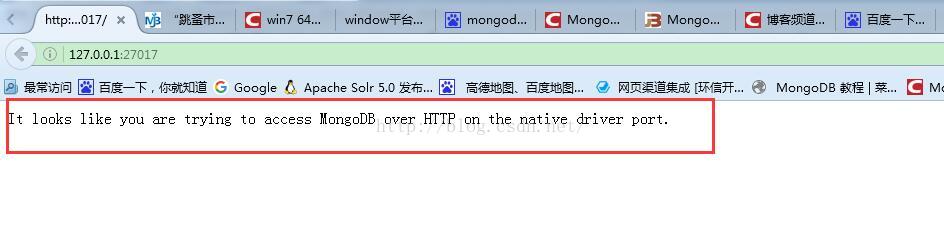 27017位mongodb的默认端口 可通过浏览器输入网址测试是否成功: 127.0.0.1:27017 安装成功之后访问会显示该提示