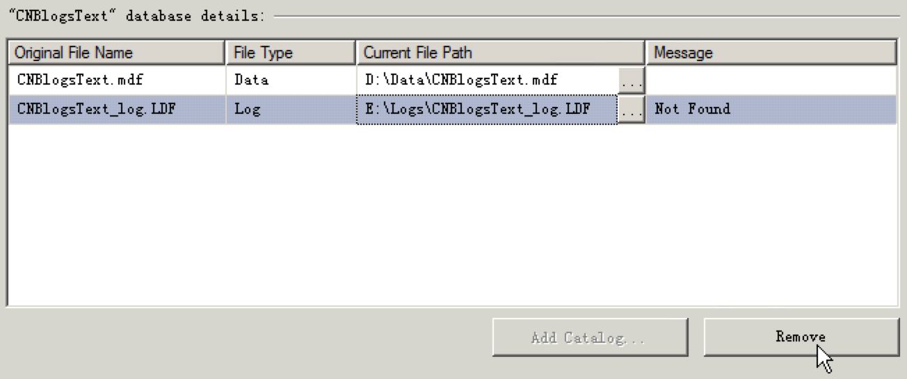 4. 移除(Remove)这个找不到的日志文件,然后点击Ok进行Attach,SQL Server会在数据文件所在的文件夹自动创建一个新的日志文件完成Attach。