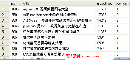 select nid,ntitle,nreadtimes,Row_number() over(order by nreadtimes desc) as rownum from article