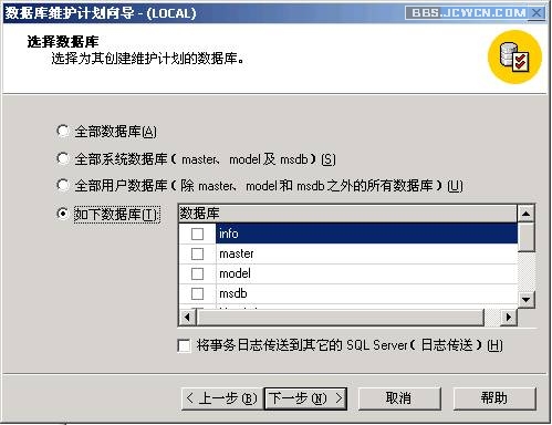 选择你想要备份的数据库,下一步。在接下来的一步中,我们默认所有选项,下一步。在当前对话框中可以选择是否检查数据库的完整性,这里我们默认就可以进行下一步就行了。对话框入图所示: