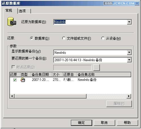 四、回复数据库备份文件(适用于用企业管理器备份的数据库)。打开SQL SERVER 企业管理器,展开SQL SERVER组LOCAL下的数据库,右键点击你要还原的数据库,选择所有任务下的还原数据库,弹出如下对话框:
