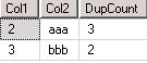 SELECT Col1, Col2, COUNT(*) AS DupCountFROM Dup1GROUP BY Col1, Col2HAVING COUNT(*) > 1