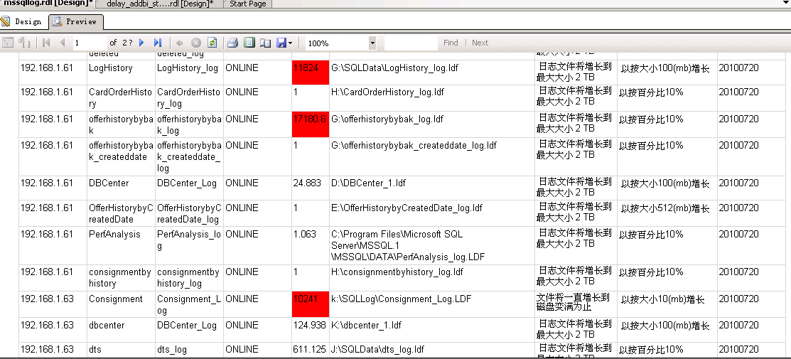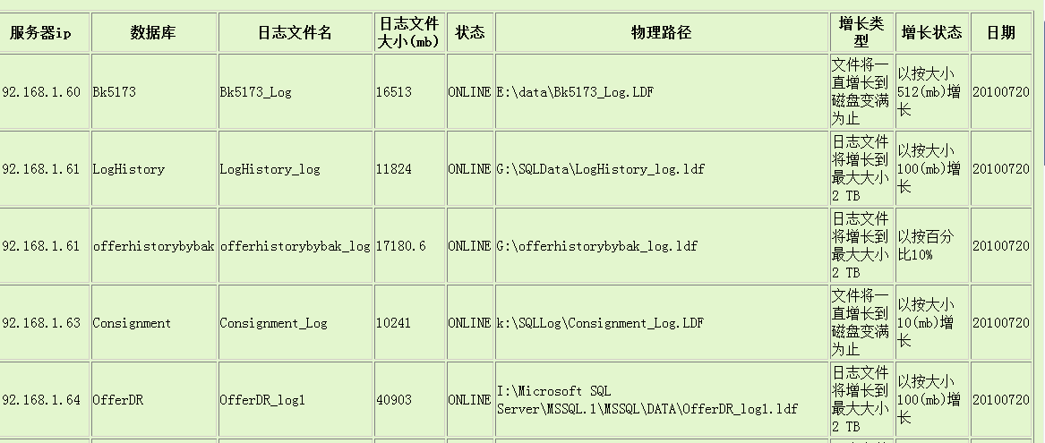 <tr><th>服务器ip</th><th>数据库</th><th>日志文件名</th><th>日志文件大小(mb)</th><th>状态</th><th>物理路径</th><th>增长类型</th><th>增长状态</th><th>日期</th>'