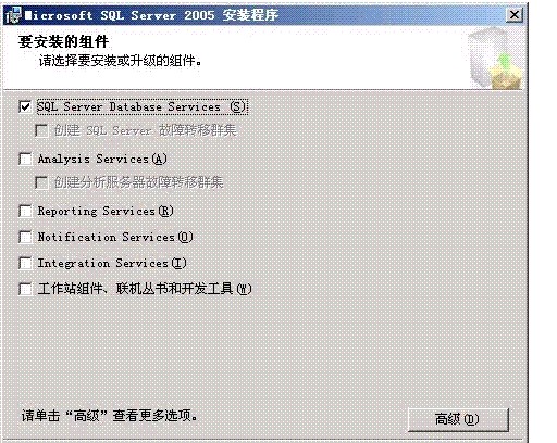 接下来输入注册信息;选择要安装的组件,这里我们只选择SQL Server Database Services组件,其他的用不着。在这个过程中我们可以点击"高级"按钮来选择安装路径。