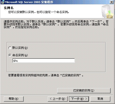 接下来在“实例名”中这是比较关键的一步,如果机子上没有别的Sql版本的,选择默认实例名就行了,但是由于我本上原装有Sql2000,所以这一步得选“新实例名”,然后输入实例名,实例名可以由A-Z或a-z的16位字母组成。