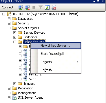 首先打开SQL Server Management Studio, 展开到Server Objects-->Linked Server, 右键单击该项选择New linked Server输入Link Server的信息。