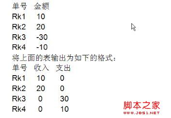 3)可以看出,首先select中应该有三个字段,并且将数据大于0的放到收入中,那么另一个为0,并且将小于0的放到支出里面,另一个为0,下面我们写实现的SQL语句: