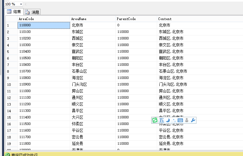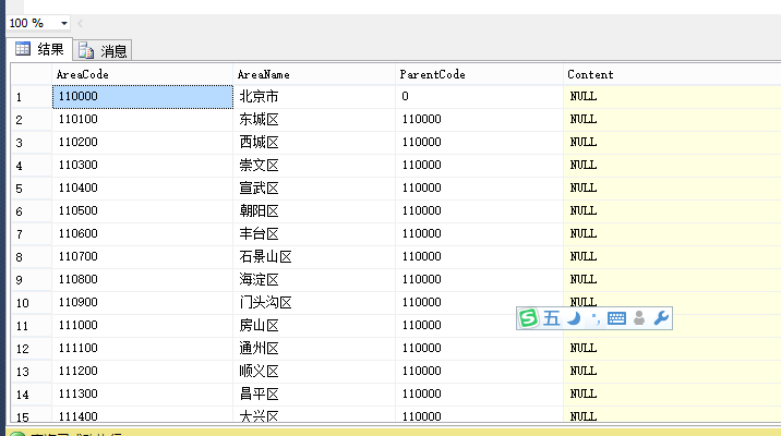 AreaCode:地区 ID AreaName:地区介绍 ParentCode:父级 AreaCode (Content---将该 AreaCode 下的所有父级 AreaName 拼成 类似:越城区,绍兴市,浙江省 字符串插入)