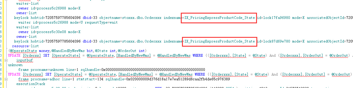 keylock hobtid=72057597785604096 dbid=33 objectname=stoxxx.dbo.Orderxxx indexname=IX_PricingExpressProductCode_State id=lock87d69e780 mode=X associatedObjectId=72057597785604096
