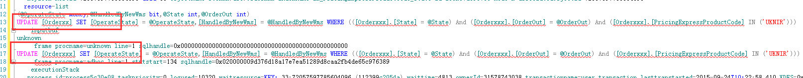 (@OperateState money,@HandledByNewWms bit,@State int,@OrderOut int)UPDATE [Orderxxx] SET [OperateState] = @OperateState,[HandledByNewWms] = @HandledByNewWms WHERE (([Orderxxx].[State] = @State) And ([Orderxxx].[OrderOut] = @OrderOut) And ([Orderxxx].[PricingExpressProductCode] IN ('UKNIR')))