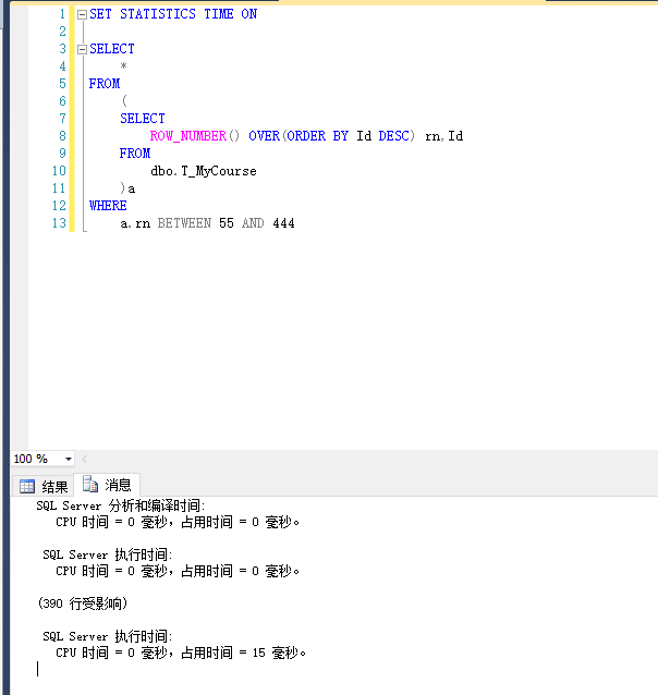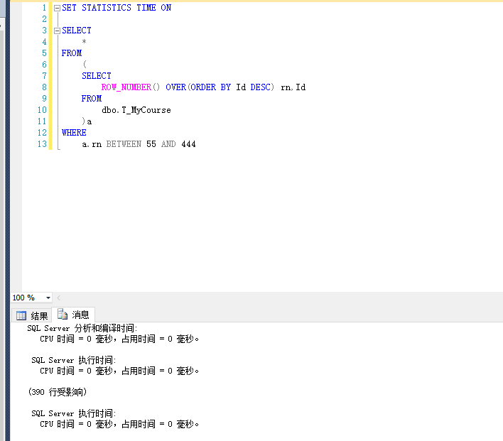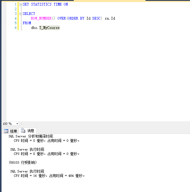 ROW_NUMBER(): SET STATISTICS TIME ON SELECT ROW_NUMBER() OVER(ORDER BY Id DESC) rn,Id FROM dbo.T_MyCourse