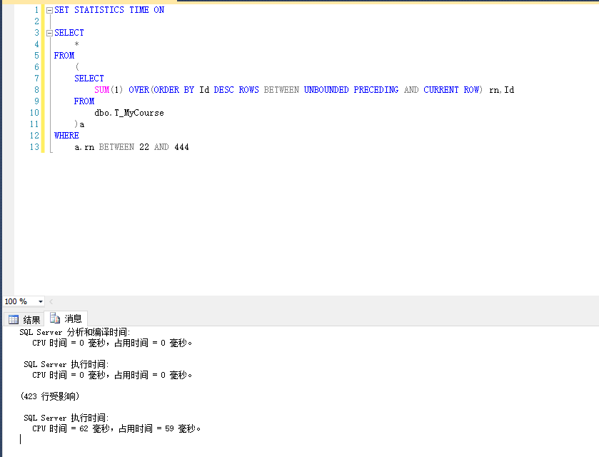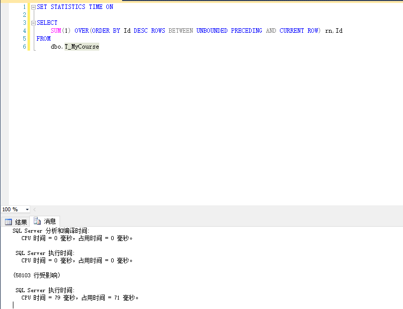 UNBOUNDED PRECEDING SET STATISTICS TIME ON SELECT SUM(1) OVER(ORDER BY Id DESC ROWS BETWEEN UNBOUNDED PRECEDING AND CURRENT ROW) rn,Id FROM dbo.T_MyCourse