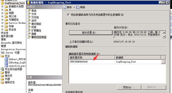主服务器LogShipping_Test库-->属性-->任务-->传送事务日志将主服务器和辅助数据库配置成功后,设置复制和还原每隔两分钟做一次传送如下图