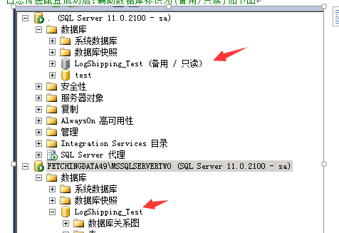 日志传送配置成功后:辅助数据库标识为(备用/只读)如下图